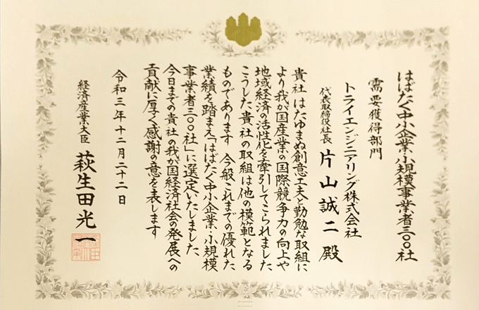経済産業省、中小企業庁が、様々な分野で活躍する革新的な製品・サービス開発、地域経済の活性化、多様な人材活用の観点から、優れた取り組みを行っている全国の中小企業・小規模事業者を表彰する「はばたく中小企業・小規模事業者300社」に選定されました。 [はばたく中小企業・小規模事業者300社」及び「はばたく商店街30選(METI/経済産業省)]