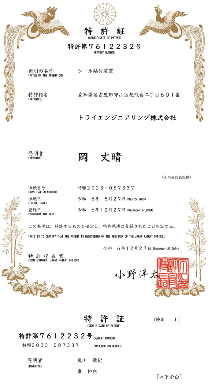 ■特許番号: 特許第2023-087337号 ■特許出願日: 令和5年5月27日 ■特許登録日: 令和6年12月27日