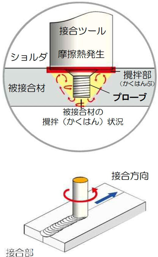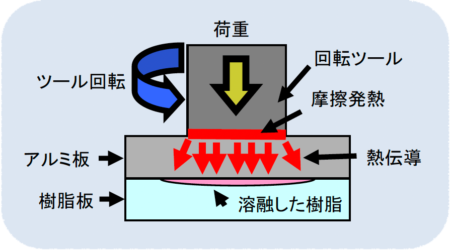 材料温度の約7割まで摩擦熱で加圧し、流動性状態(水あめ状)になった金属を拡販し接合する工法