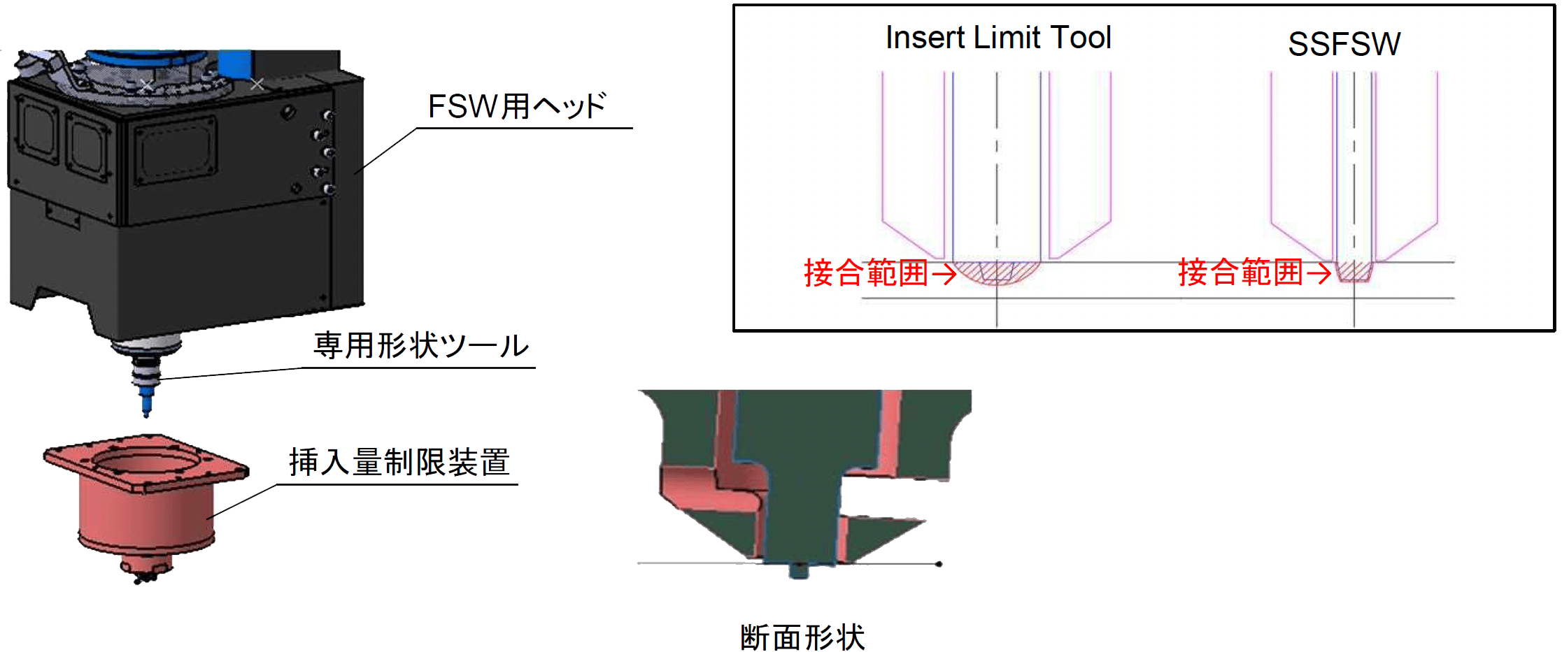 接合ツール周辺に設置した挿入量制限装置により、ツールの挿入量を制限するため、安定した接合が可能。