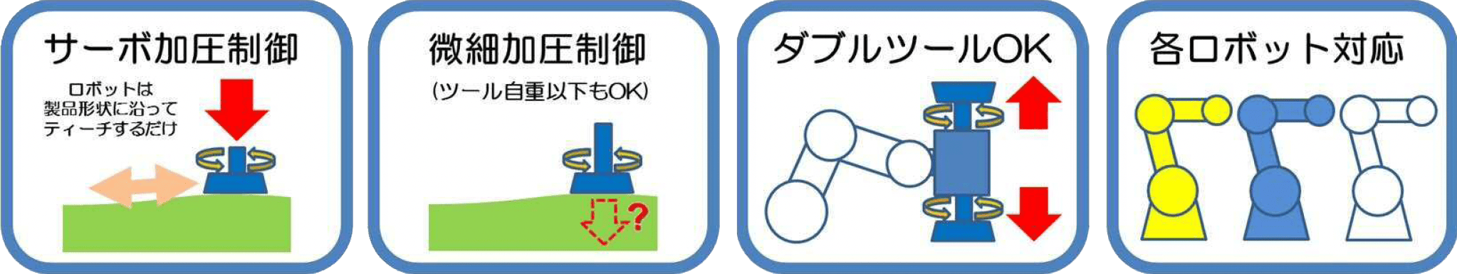 ロボット外部の独立した制御となるモーションコントローラーを核としたサーボ加圧制御により、各ロボットメーカー製産業用ロボットに対応したシステム。