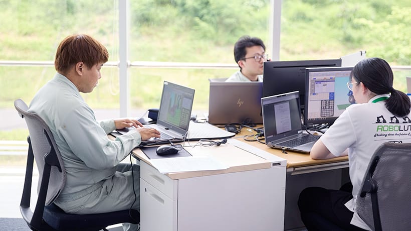業務は実機によるティーチングや調整作業、オフラインでのプログラム作成など多岐にわたります。案件の進捗状況によってスケジュールは変わりますが、オフライン業務の日は一日中PCに向かうことも。社内での実機ティーチングや調整に加え、設備導入時にはお客様先での現地工事も担当しています。